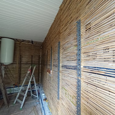 Isolation des murs intérieurs en ossature bois – Steico Flex 10 cm – Etanchéité à l’air – Contrelattage – Canisse + murs chauffants – Enduits terre 4cm – Enduits de finition