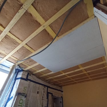 Isolation des faux plafonds en ossature bois – 2 couches croisées de laine de bois Steico Flex 18 cm + 8 cm – Etanchéité à l’air – Contrelattage - Plaquage fermacell